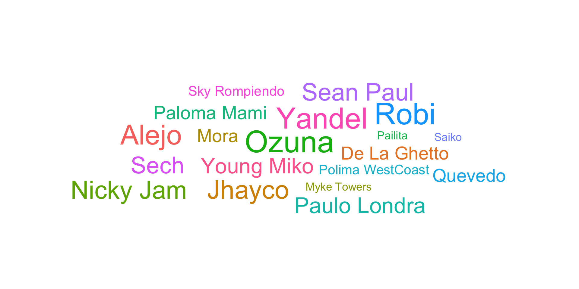 Con la visualización a través del Word Cloud, se puede apreciar que Feid ha colaborado con artistas como Young Miko, Ozuna, Yandel, entre otros.