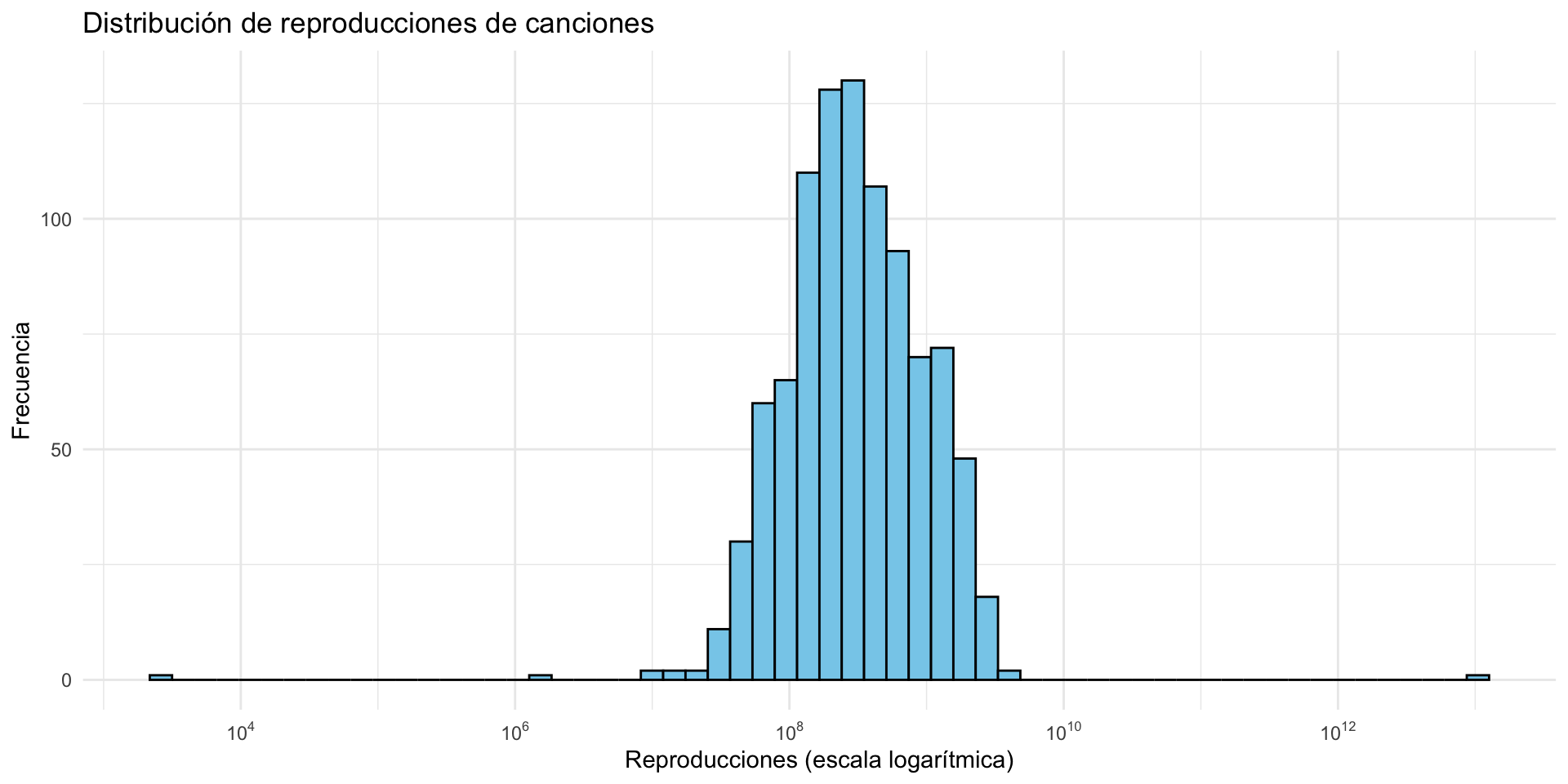 Objetivo: Analizar cómo se distribuyen las reproducciones entre las canciones populares.