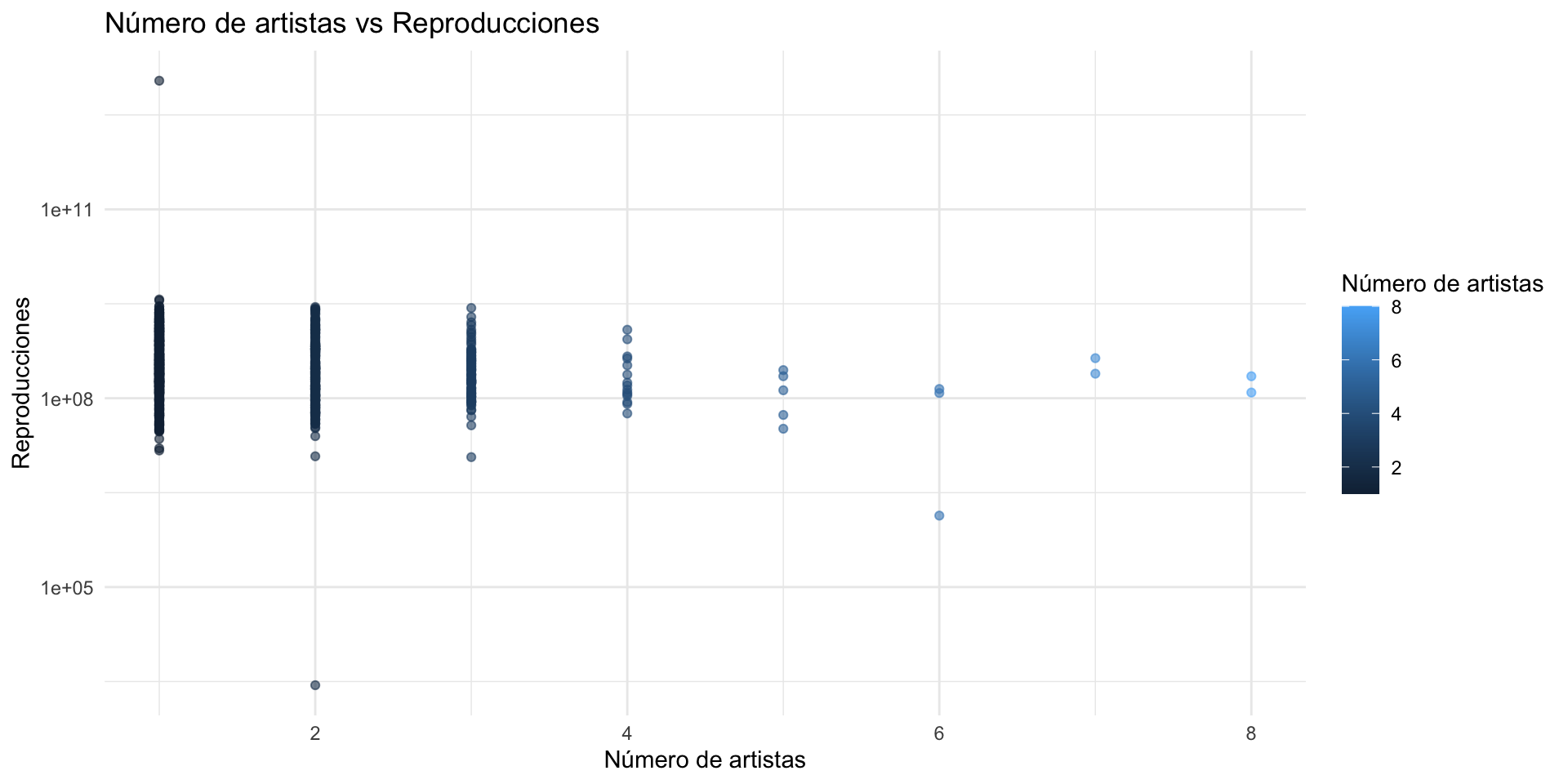 Objetivo: Explorar la relación entre el número de artistas en una canción y su éxito en términos de reproducciones.