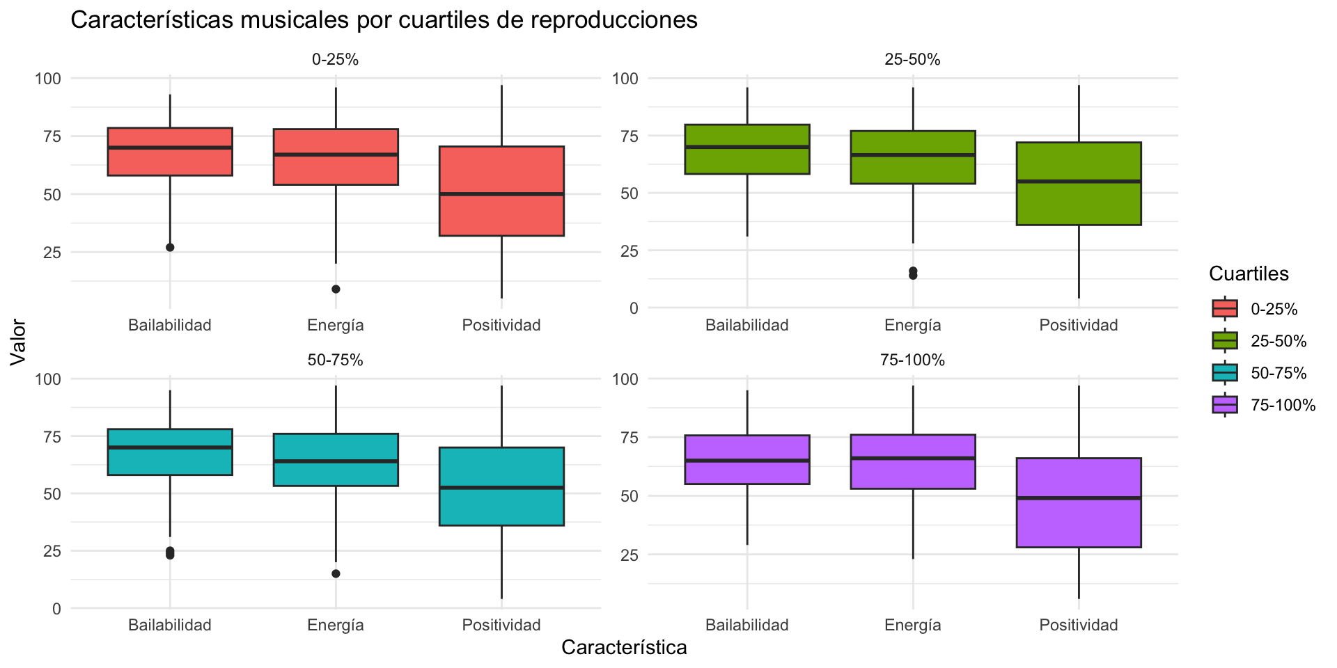 Método: Clasificación de las canciones en cuartiles según sus reproducciones y posterior análisis de las características musicales para cada cuartil mediante gráficos de caja.