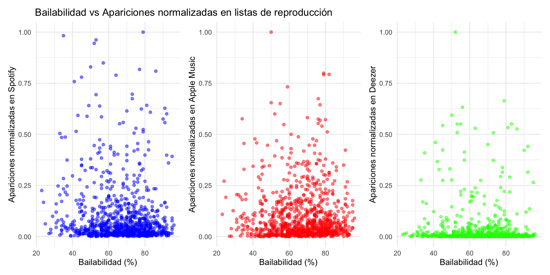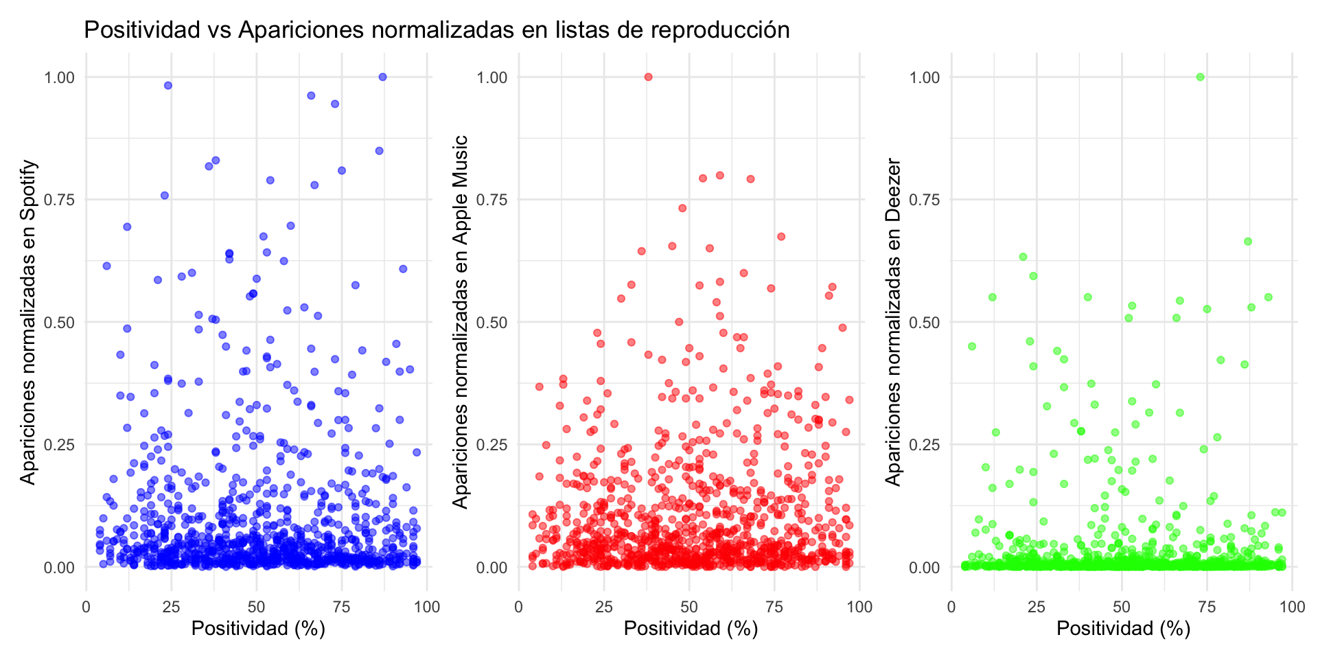 En este caso buscamos averiguar si las características musicales específicas —bailabilidad, energía y positividad— de las canciones se correlacionan con su presencia en listas de reproducción en distintas plataformas de streaming musical (Spotify, Apple Music y Deezer).